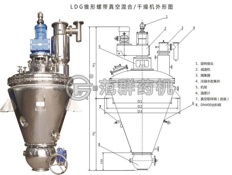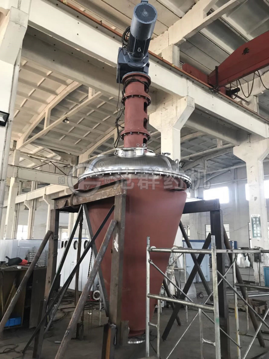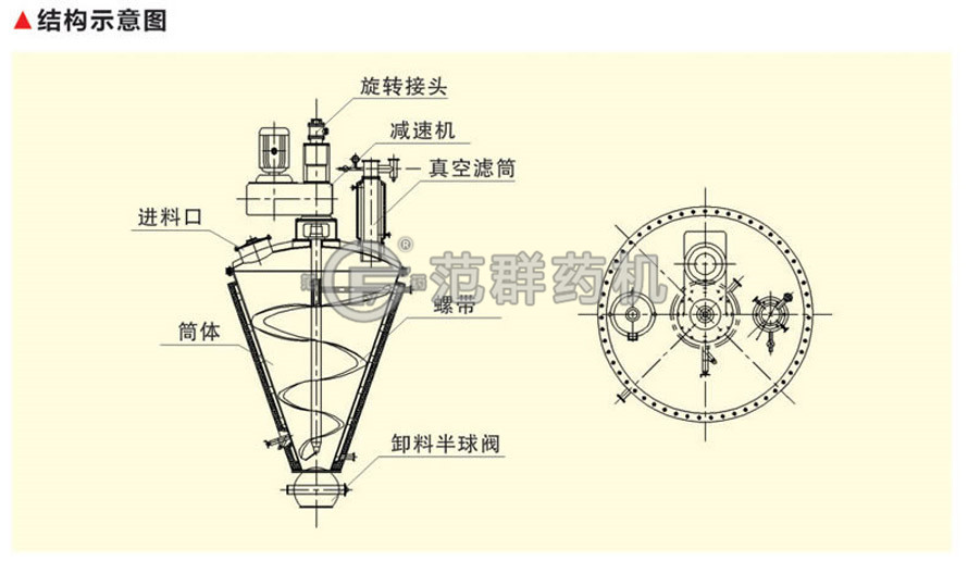 內加熱螺帶錐形真空干燥機是一種利用螺帶將物料旋轉提升及圓錐夾套、空心螺帶內同時通入傳熱介質(如熱水、導熱油、蒸汽等),使加熱后物料從四周提升并從中間下落,快速不斷的循環翻轉,并通過筒體內抽真空將水汽及時帶走, 使物料在短時間內達到干燥和混合目的。