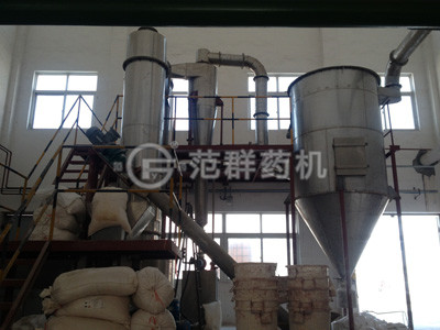 熱空氣切線進入干燥器底部,在攪拌器帶動下形成強有力的旋轉風場。膏狀物料由螺旋加料器進入干燥器內,在高速旋轉攪拌槳的強烈作用下,物料受撞擊、磨擦及剪切力的作用下得到分散,塊狀物料迅速粉碎,與熱空氣充分接觸、受熱、干燥。脫水后的干物料隨熱氣流上升,分級環將大顆粒截留,小顆粒從環中心排出干燥器外,由旋風分離器和除塵器回收,未干透或大塊物料受離心力作用甩向器壁,重新落到底部被粉碎干燥。