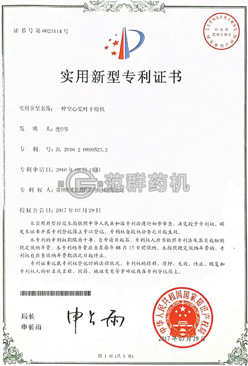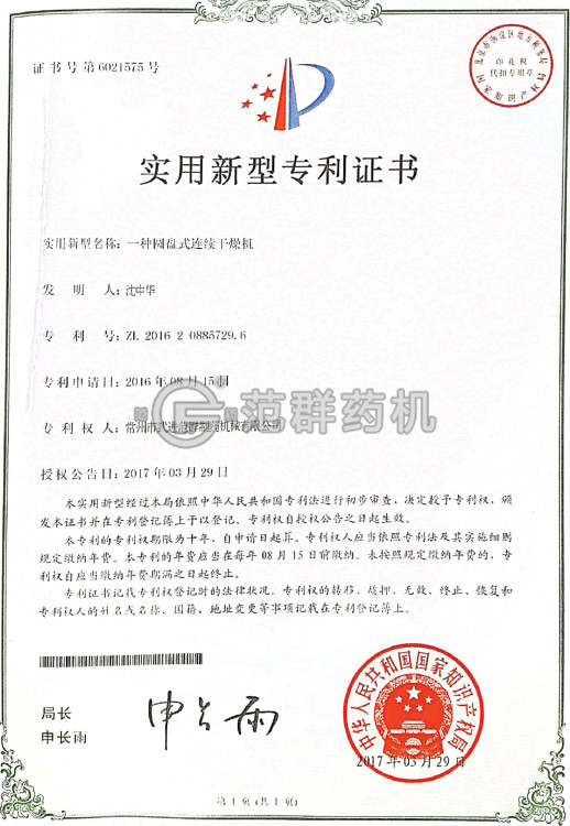 空心槳葉干燥機專利證書1